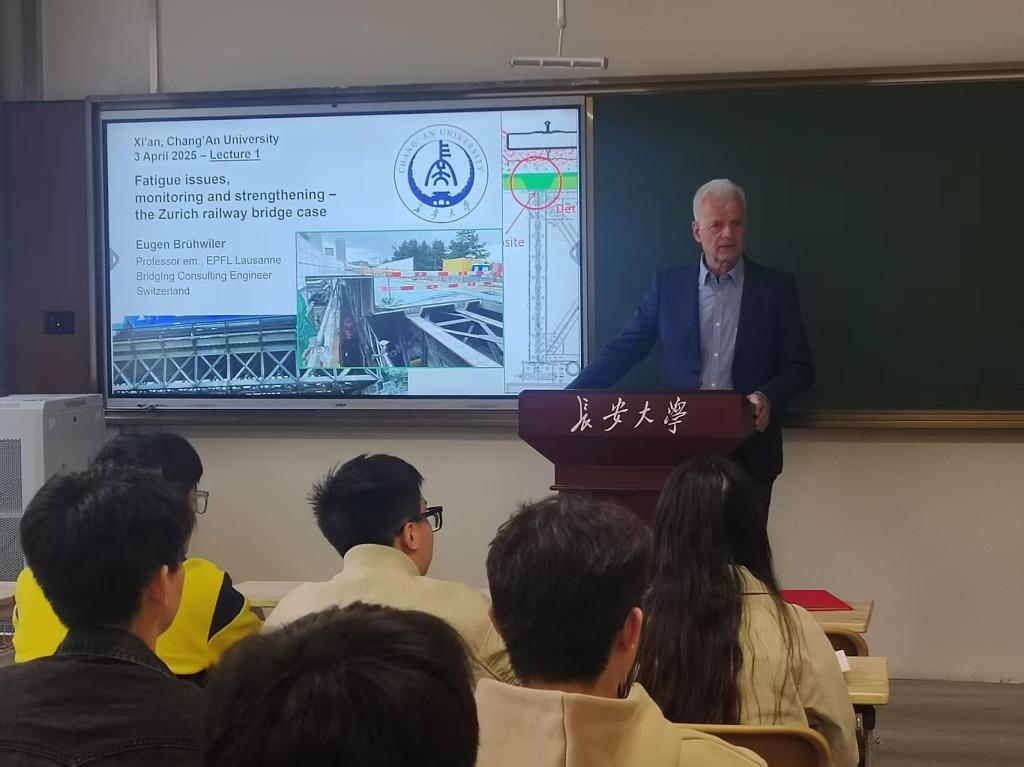 4月3日Brühwiler教授做了题为“Fatigue issues, monitoring and strengthening – the Zurich railway bridge case”和“UHPFRC for the improvement of reinforced concrete bridges”的2场学术报告。桥梁系教师和近40名研究生聆听了学术讲座,参会师生就钢桥加固新技术、UHPFRC组合结构桥梁研究与实践新进展等,与Brühwiler教授进行了深入探讨和交流。来访期间,Brühwiler教授与亚洲博彩app