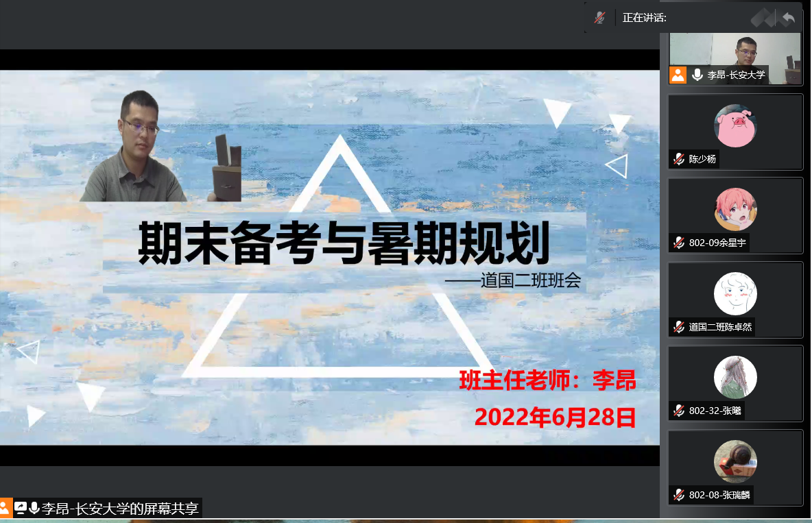 6月28日晚,学院2020级道国二班通过腾讯会议召开期末备考与暑期规划线上主题班会,班主任李昂及道国二班全体同学参加班会。班会由班长陈少杨主持。